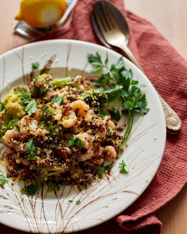 При мен се получи като оползотворяване на остатъци, но можете да си направите това ястие и без такъв повод и няма да съжалявате. Аз имах броколи на пара, останали от един обяд и киноа с маслини и сушени домати, останала от друг обяд. Имах също и един пакет с дребни диви скариди от Северно море, който се доближаваше опасно до края на срока си на годност и това реши съдбата им.