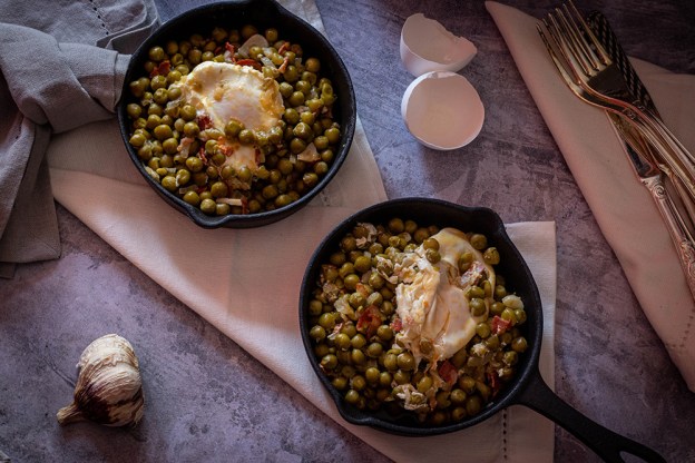 Днешната рецепта напомня шакшука, но вместо сос от домати и чушки, се слага грах. Става идеално за обяд или лека вечеря – обърнете внимание на енергийната стойност.
