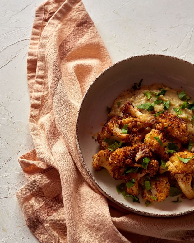 Днес ви предлагам една топла есенна салата, за която можете да направите заготовки и да ускорите приготвянето. В нея имаме печени карфиол, червен лук и нахут (сварен предварително), върху подложка от тиквен хумус. Хумусът може да се приготви предварително и да се съхранява в хладилника 3 – 5 дни. Можете да го използвате като дип или както в тази рецепта – като канапе.