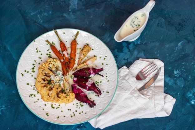 Стек от карфиол с бейби кореноплодни и млечен сос