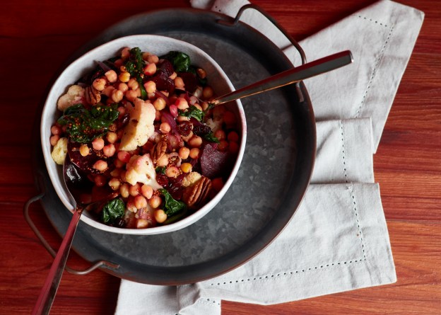 Днешната салата освен вкусна е и много красива, с наситени ярки цветове. По замисъл е веган, но за хората, които не могат без месо, ще добавя, че я пробвахме с добавка от ситно нарязано печено пиле (останало от предишния ден, без да го затоплям) и резултатът беше чудесен.