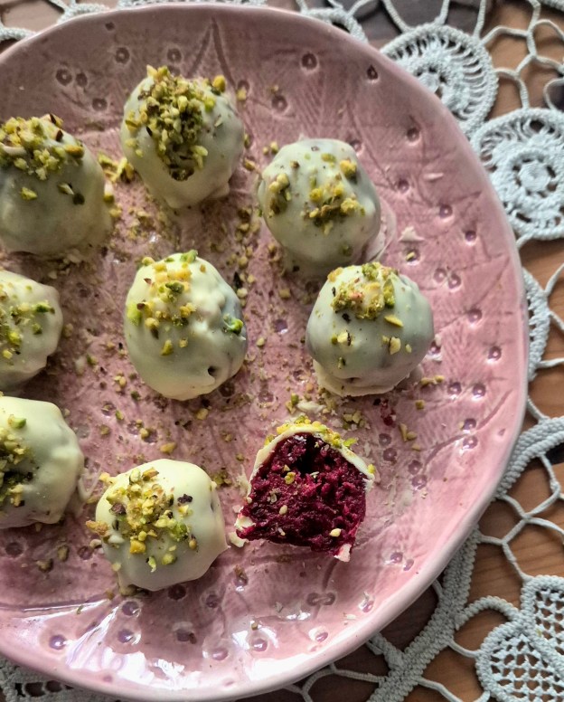 Преди уикенда ви предлагам още една рецепта, която може да мине за празнична – сурови бонбони с червено цвекло и бял шоколад. Идеята е от любим профил – Blond fox, където видях едни подобни с ароматите на морковена торта и реших да пробвам. Подсладени са с фурми и са ароматизирани с портокалова кора.