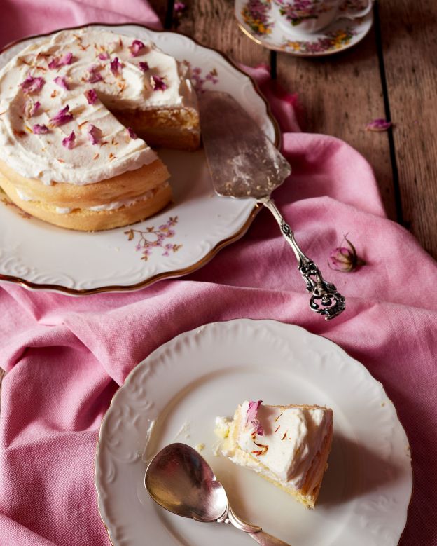 През февруари за пръв път направих този невероятно сполучлив кейк във вариант с цитруси и тогава споделих историята на интереса ми към рецептата. Днес ви предлагам една флорална версия със сироп от бъз в кейка и розова вода и венчелистчета в сметаната.