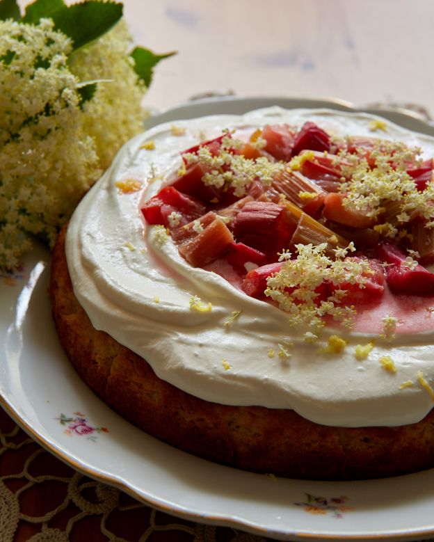 През май двата продукта – ревен и бъз – си дават среща в градините и реших да ги съчетая в един десерт. Идеята за комбинацията е от Good Food, но кейкът е различен, понеже държах да е без глутен, с възможно най-малко въглехидрати и с повечко протеин. Затова заложих на една изпитана рецепта с извара (или рикота) и брашна от елда и бадеми.