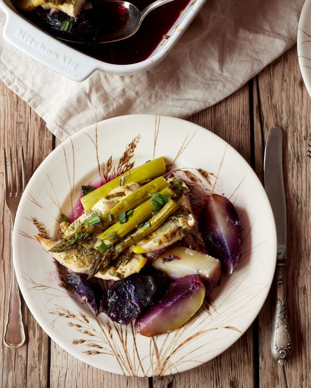 От серията „спасяваме забравени продукти“, това ястие е лесно, бързо и много вкусно. В него влязоха един голям лилав морков, отлежаващ в дъното на кошницата за зеленчуци повече от 2 месеца, няколко пресни картофа на 3 седмици и последната връзка аспержи от първата доставка – на почти 2 седмици. Имах пакет пилешко бон филе, да им прави компания във фурната.