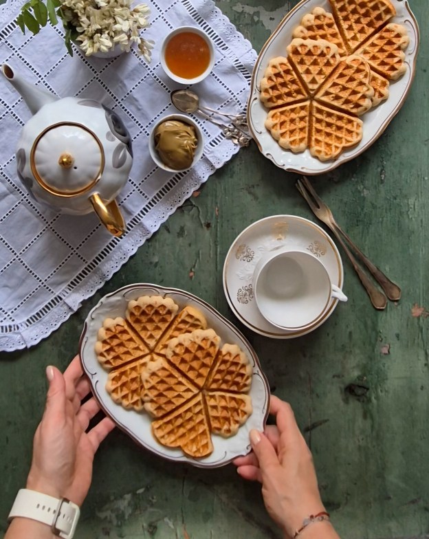 Дългият уикенд около 24ти май беше много хладен и дъждовен. Идеален за излежаване и късна закуска с гофрети. Този път в пролетен вариант с ароматни цветове от акация.