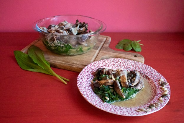 Отново по темата за пролетта и зеленолистните зеленчуци, които са толкова полезни, но често не получават заслуженото внимание в ежедневното ни меню. Обикновено се оправдаваме с липса на време, затова от сега ви казвам – тази рецепта е изключително бърза и лесна. Ако имате продуктите, няма да ви отнеме повече от половин час от ваденето от хладилника до готовото ястие. Гъбите и сирената добавят протеин и правят ястието не само вкусно, но и засищащо. Идеално е за пролетните вечери, с чаша бяло вино. Става също и за предястие.