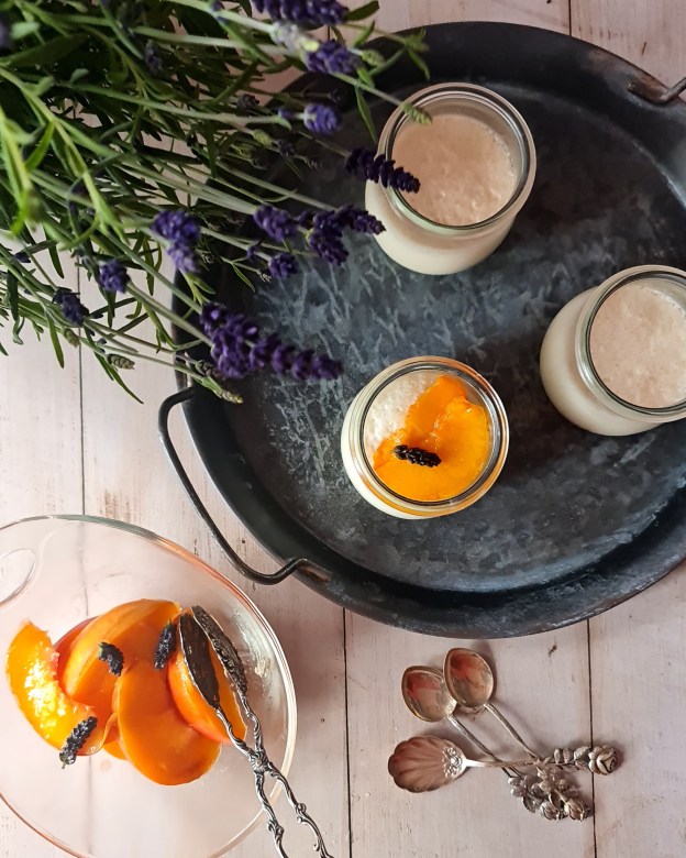 Мус от бял шоколад и скир с праскови и лавандула