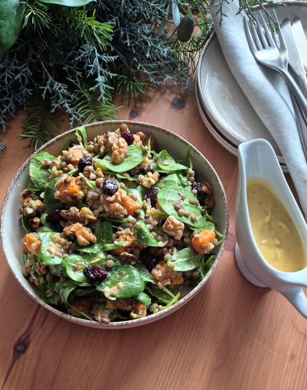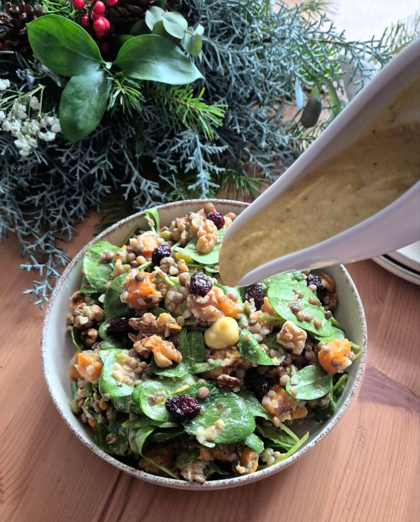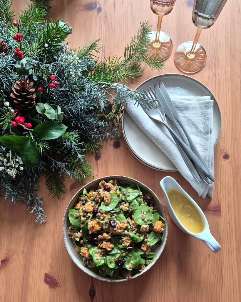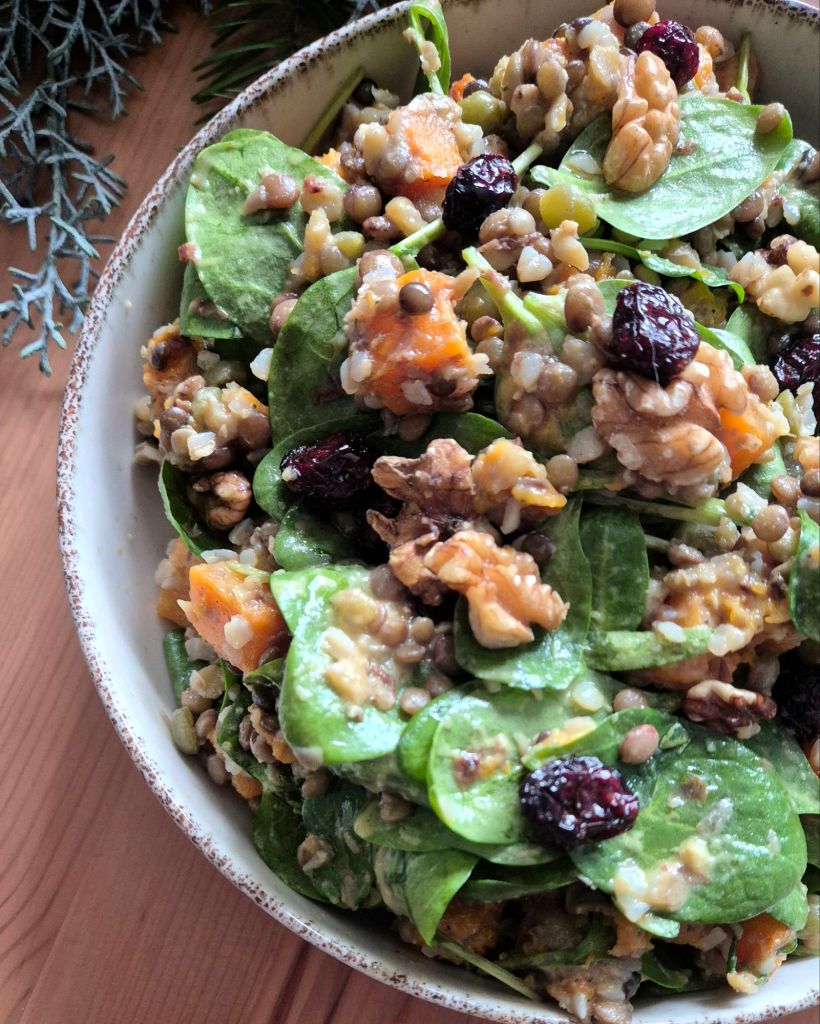 Това е номер 4 в поредицата салати с леща, приготвени за нашия 1во-януарски брънч. Тази година я направих с печена тиква, която мариновах предварително с бахарат, спанак и орехи. Използвах микс от различни сортове леща, а идеята за тиквения сос е от профила на Ани Healthilicious. Завърших с шепа червени боровинки.