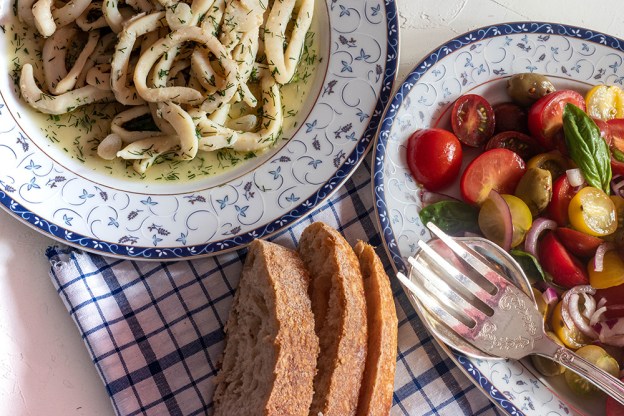 Лятото е най-подходящо за морски дарове. Пасват му някак си и са ми най-вкусни точно в тези месеци, макар и да са на разположение целогодишно. Днешната рецепта не е стриктно гръцка, но бих казала, че добре се вписва в тази традиция. За пълнежа се спрях на ориз, сушени чери домати и каперси които допринасят за средиземномрския вкус. Добавих и дребни скаридки, благодарение на които ястието има над 30 г протеин в една порция.